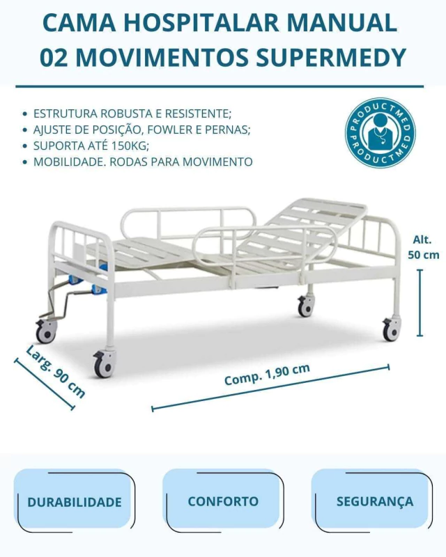 Fabricada em aço de alta resistência, a Cama Hospitalar 2 Manivelas garante a máxima segurança e durabilidade. Sua estrutura robusta foi projetada para suportar o uso contínuo e prolongado, oferecendo estabilidade e confiança para o paciente e o cuidador. Com capacidade para até 150 kg, esta cama é adequada para uma ampla gama de usuários.